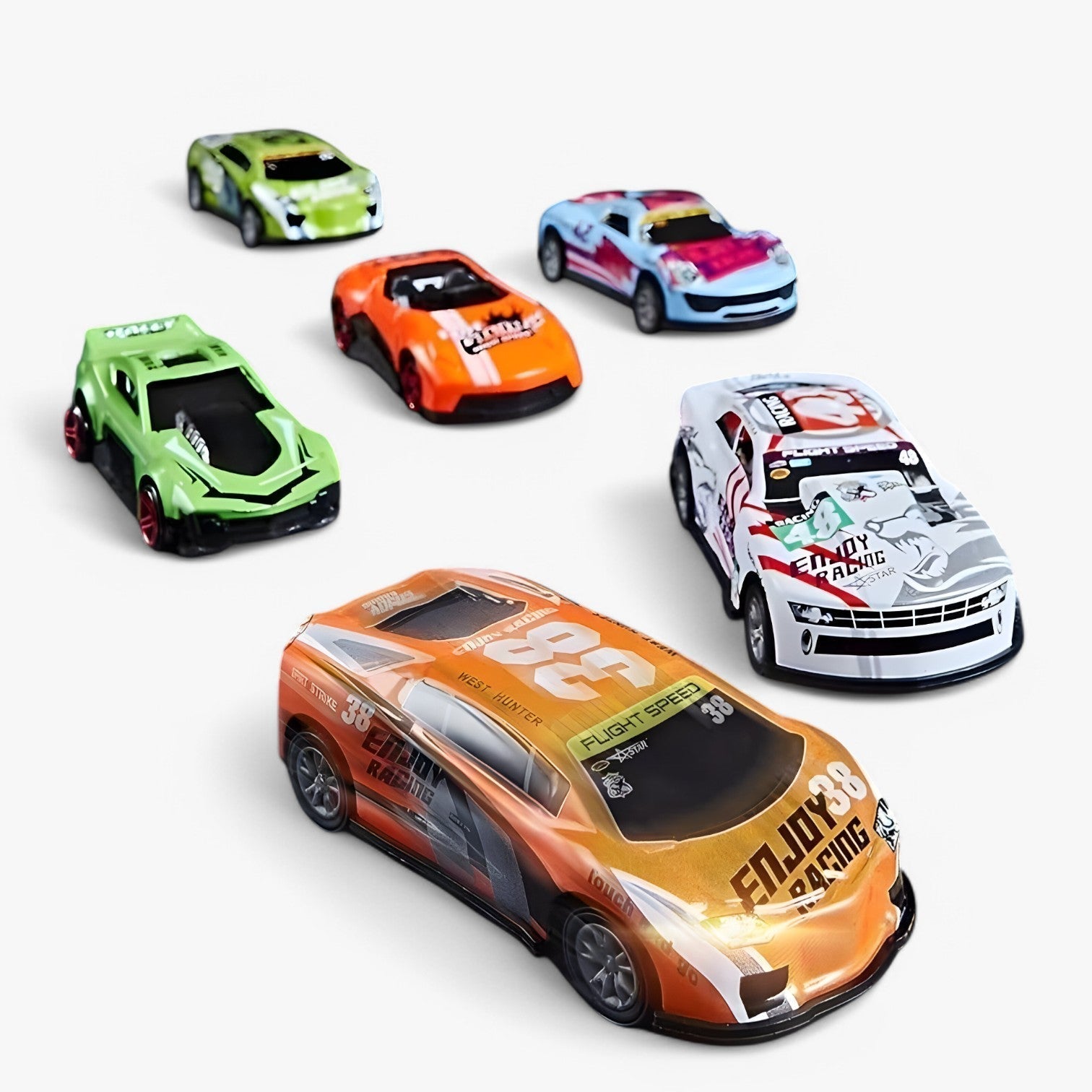- 6 × mini-raceauto’s in verschillende kleuren